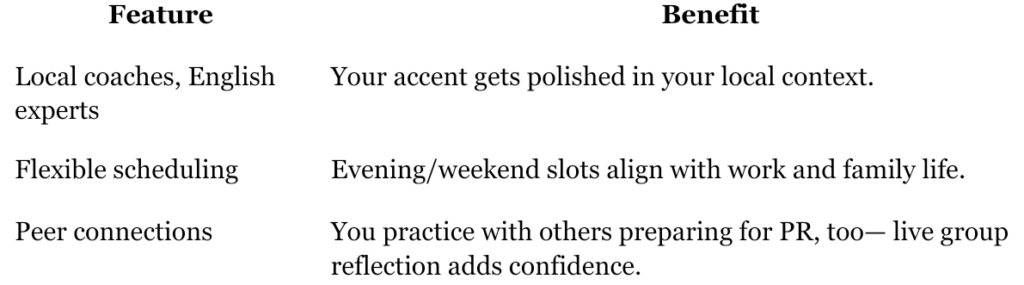 - Professionals targeting PR-approved roles You’ve got the résumé—but you also need conversational polish. Our sessions sharpen your presentation, ensuring you sound like a credible, confident decision-maker.